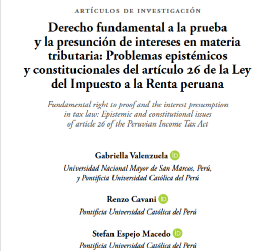 Comparto con ustedes una alegría: finalmente fue publicado el artículo «Derecho fundamental a la prueba y la presunción de intereses en materia tributaria: Problemas epistémicos y constitucionales del artículo 26 de la Ley del Impuesto a la Renta peruana», en la Revista Pro Jure (Scopus Q2) de la Pontificia Universidad Católica de Valparaíso, coescrito con Gabriella Valenzuela y Stefan Espejo.