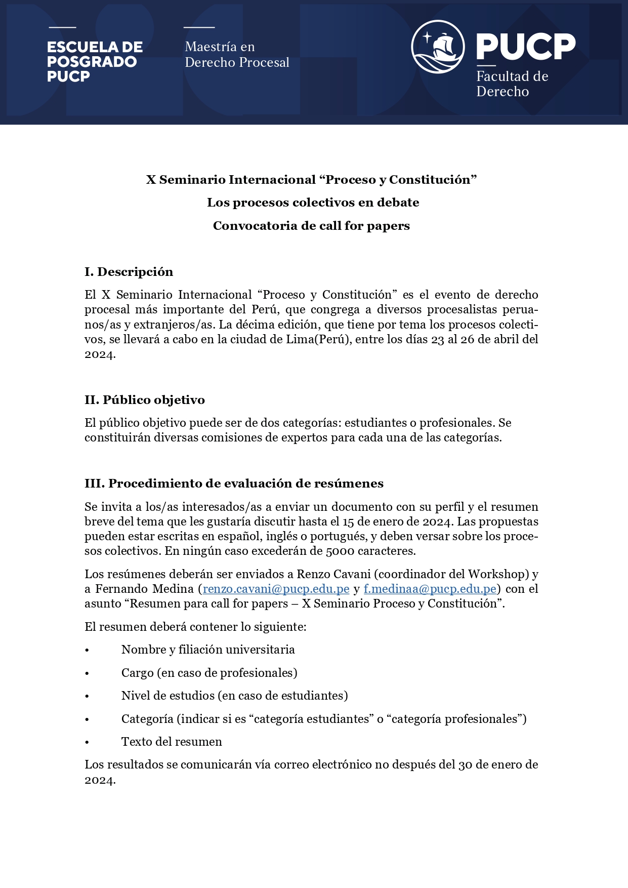 Aún sigue abierta esta convocatoria para participar con una exposición en el X Seminario Internacional «Proceso y Constitución», en Lima, Perú (23-26 de abril). El tema: Procesos colectivos.